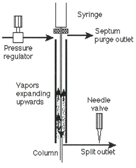 由于顶空分析主要是痕量分析,分流流速通常比上述30-60毫升/分钟低得多。这留下了以相应降低的速率注入蒸汽或者将蒸汽暂时储存在汽化室中的选择。后者符合惯例。如果注入的样品多于同时流出的气体,则必须在注入系统中更换载气。带有合理设计的后压力调节器和分流出口针阀的注射器,其气源内部体积较大,分流出口内部体积较小,导致样品后向膨胀(图2)。需要一个长的注射器针头,使样品从色谱柱入口附近的一个点向后膨胀。如果衬管长80毫米,柱进入5毫米,注射头高约12毫米,注射器针头长约80毫米。常用的5 cm针进入内胆不到4 cm,只使用上半腔。以这种方式注入的500l已溢出注射器衬套,导致样品材料通过隔膜吹扫出口排出或穿透载气供应管线。