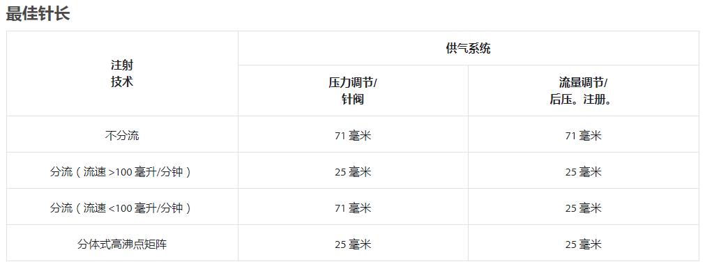 用于汽化GC注射器的5 cm针头是一个典型的折中方案:介于理想的长针头和理想的短针头之间,但几乎从来都不理想。下表建议了最佳针长。