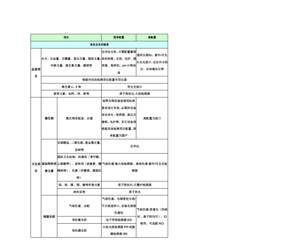1)检测品质项目通常要考虑使用的标准或根据客户要求,配置相应的检测仪器和设备(参照1. 企业实验室品质项目一段)。由于不同商品和不同客户可对同一项目可能提出不同的检测标准或方法,对于这些项目的检测,若方法规定采用化学法分析,只需配置最简单的设备即可(参照1. 企业实验室品质项目一段)。如果经费充足或检验批次较多,对应的检测方法又有仪器法的,可配置相应的专用仪器,如:水分测定仪、凯氏定氮仪、快速脂肪测定仪、糖度计、粘度计、脂肪酸分析仪等。通用仪器也可参照企业实验室品质项目一段。如果有需要,像氨基酸分析仪这样的专用分析仪也可以配置。