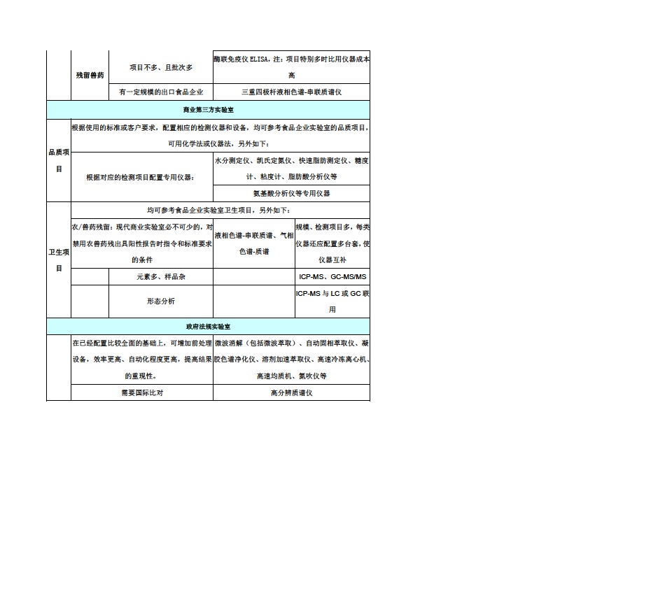 2)卫生项目检测的实验室配置参见“1. 企业实验室”相关段落。个人认为对于一个现代商业实验室液相色谱-串联质谱、气相色谱-质谱是不可少的,这是现在对禁用农兽药残出具阳性报告时指令和标准要求的条件。如果有规模、检测项目多,每类仪器还应配置多台套。这时要考虑仪器性能的互补,如:液相色谱-串联质谱一台配电喷雾电离源,一台配大气压化学电离源;气相色谱-质谱一台配电子轰击源,一台配负化学电离源。元素多、样品杂,还可以考虑配置等离子发射光谱-质谱仪、气相色谱-串联质谱仪等。如果要做形态分析,等离子发射光谱-质谱仪还应能与液相色谱或气相色谱联用。