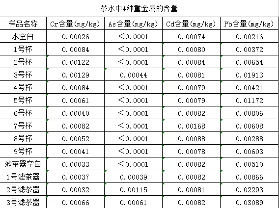 分析测定茶水中的铅、砷、镉、铬的含量。