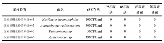 针对其中的4个优势物种,包括不动杆菌1(Acinetobacter radioresistens),不动杆菌2(Acinetobacter sp.),纳西菌(Naxibacter haematophilus)和假单胞菌(Pseudomonas sp.)进行温度和抗生素敏感性实验,结果表明,4个菌株在正常的生长条件下,对75℃以上温度和青霉素、氯霉素都敏感。