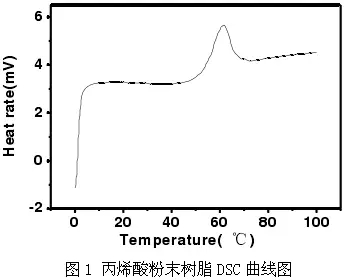目前,高分子行业测定玻璃化转变温度的通用方法是差示扫描量热法。差示扫描量热法测定玻璃化转变温度就是基于聚合物在玻璃化转变温度时,热容增加这一性质,在差示扫描量热分析曲线上,表现为在通过玻璃化转变温度时,基线向吸热方向移动。图1给出一种粉末涂料用丙烯酸树脂差示扫描量热分析曲线图,其中树脂玻璃化转变温度为57℃。
