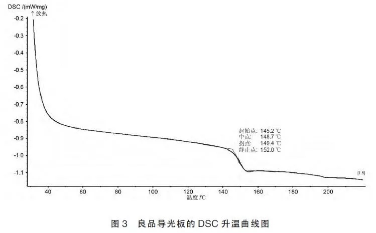 案例1:两种导光板,其中一种导光板使用几个月后出现发黄现象,另一种导光板没有出现发黄现象。用红外光谱法分析两种导光板的成分差异,结果如图1 所示,发现良品导光板和发黄导光板的红外光谱图吻合的非常好,看不出明显的差异,从其特征峰可判断这两种导光板材质为聚碳酸酯[3],但差示扫描量热仪测试结果表明两者的玻璃化转变温度(Tg)相差8℃左右,结果如图2 和图3所示。聚碳酸酯按醇结构的不同,可将其分成脂族、芳族、脂- 芳三大类[4],脂肪族聚碳酸酯耐热性、机械性能都较低,由DSC 结果知,Tg 为140.9℃的导光板是含有脂肪族的聚碳酸酯,Tg 为148.7℃的导光板为含有芳族结构的聚碳酸酯,从而可以鉴别出两种导光板的差异,进而分析出失效导光板发黄的原因。