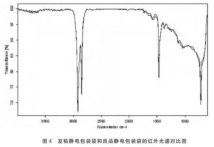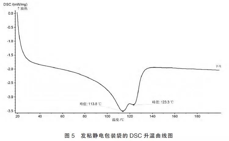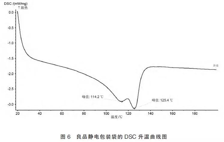 案例2:两批次防静电包装袋,其中一批次防静电包装袋在使用过程中出现发粘现象,而另一批次防静电包装袋未出现发粘现象,从红外谱图(如图4 所示)上得出发粘静电包装袋与良品静电包装袋的红外光谱图完全一致,看不出明显差异,从其特征峰可判断这两种静电包装袋的材质均为聚乙烯,对这两种静电包装袋进行DSC 分析,从差示扫描量热仪曲线(如图5 和图6 所示)上可以看到,发粘静电包装袋和良品静电包装袋都有两个熔融峰,所不同的是两个熔融峰的相对强度不同,从熔融温度可推断这两种静电包装袋的主成份为两种不同密度的聚乙烯混合物,对于聚乙烯,密度高其熔融温度也随之增高,耐热性也增加[4],从放热峰的相对强度知,相对于良品静电包装袋,发粘静电包装袋的低密度的聚乙烯成分较多,所以其耐热性较低,使用过程中就容易发粘。