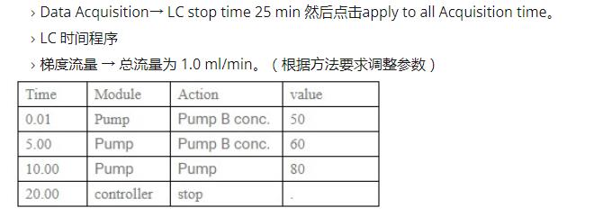 》 将柱清洗系统设置为 A 二流动相, 00 %、 B 二甲醇 1 00 %、 C 二乙睛 1 00 %和 O 二水 1 00 %的初始组成,然后将柱温箱置于@ 25 至 6 ooC 并将流量设为 1 . om } /分钟并按下泵按钮。》将流量设置为 1 . 0 毫升 Z 分钟,佰对寺 1 分钟并检查是否有泄漏。让系统平衡 2 分钟。