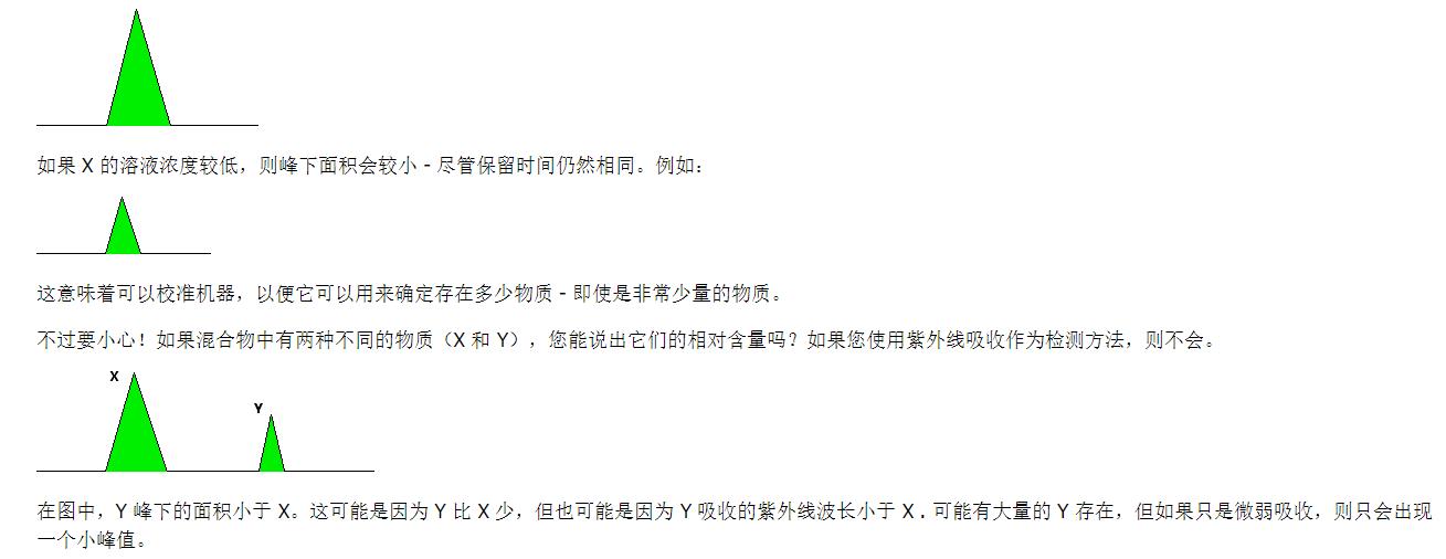 如果您将含有已知量纯 X 的溶液注入机器,您不仅可以记录其保留时间,还可以将 X 的量与形成的峰联系起来。峰下面积与通过检测器的 X 量成正比,该面积可以由连接到显示器的计算机自动计算。它要测量的区域在(非常简化的)图中以绿色显示。