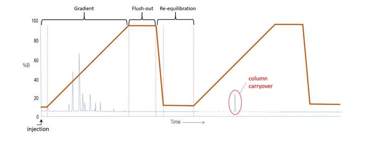 经典残留物观察到的结果是,当空白连续注射时,残留峰的大小有规律地减小。例如,第一个空白峰可能是原始大小的1%,然后下一个空白峰又下降了100倍。这种承载通常是由流路中的机械区域引起的(例如,阀头中的两个表面,管道插入其中,螺母被型锻)。在空白进样期间,一些样品的保留会逐渐稀释,导致每次空白运行期间的残留量逐渐减少。