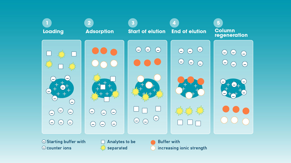 通过增加洗脱缓冲液的离子强度在IEX分离分析物的示意图。从装载、吸附和洗脱到柱再生结束,分子在柱中移动。