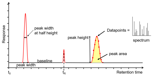 这显示了检测器内分析物峰的测量响应。此处的基线表示从检测器接收到的信号,其中没有分析物从色谱柱中洗脱或低于检测限。在发现基线高于平常的情况下,它被视为问题的指示或检查维护的指示。诸如基线宽度、半高宽度、面积和总高度之类的测量值可以从峰中撤消。 为了获得更好的灵敏度和更好的分辨率,需要更窄、更锐利的峰。测量的准确度受峰值上存在的数据点总数的影响。