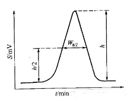 如图所示,由于色谱峰外形接近于等腰三角形,所以根据计算等腰三角形面积的计算方法,近似地认为峰面积A等于峰高h乘半峰宽Wh/2(Wh)