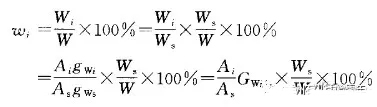 把一定量的纯物质作内标物,加入到已知质量的样品中,然后用气相色谱仪进行分析,测定内标物和样品中几个组分的峰面积。引入相对质量校正因子,就可计算样品中待测组分的质量分数(wi),其计算公式如下: