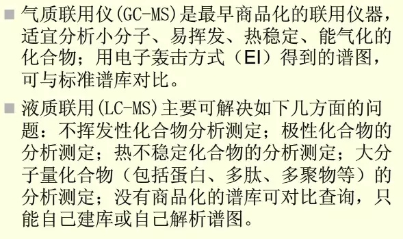 气质联用仪与液质联用仪的区别主要是提供分离的方式不同,因此影响到使用范围。例如,如果需要测试的组分是热不稳定或者受热易降解,就比较适合采用液质联用进行分析检测,同样的易挥发组分则比较适合采用气质联用进行分析检测;也就是说,气质联用与液质联用对很多小分子的分析检测是一样的。大分子的分析检测因为沸点和分子量的限制,更适合采用液质联用进行分析检测。最近有关单位已经拟开展使用LCMS来进行新生儿筛查、维生素检测以及血药浓度检测等项目。
