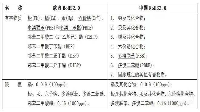 2018年3月12日,工业和信息化部发布了《电器电子产品有害物质限制使用达标管理目录(第一批)》和《达标管理目录限用物质应用例外清单》的公告,自公告之日起一年后施行。纳入目录的产品,铅、汞、镉、六价铬、多溴联苯和多溴二苯醚的含量应该符合电器电子产品有害物质限制使用限量要求等相关标准,并纳入电器电子产品有害物质限制使用合格评定制度管理范围。第一批达标管理目录包括了12类电器电子产品。