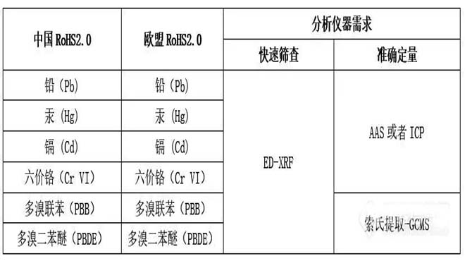 中国RoHS2.0和欧盟RoHS2.0由于对管控物质上差异,因此在对分析仪器需求上也带来差异。中国RoHS2.0管控六项物质,与欧盟RoHS2.0前六项物质相同,其需要对应分析仪器如下表所示: