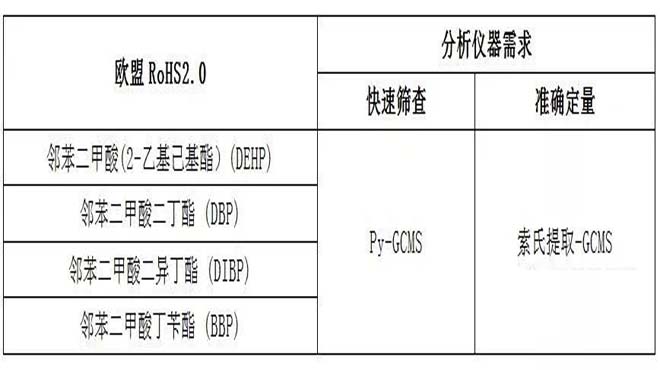 由于欧盟RoHS2.0新增四项邻苯二甲酸酯检测要求,但中国RoHS2.0法规目前对其并没有管控,因此对于出口型企业,为了应对欧盟RoHS2.0法规管控需求,根据IEC62321-8《电子电气产品中某些物质的测定 第8部分:使用气相色谱质谱联用仪,配有热裂解热脱附的气相色谱质谱联用仪 (Py-TD-GC-MS)测定聚合物中的邻苯二甲酸酯》标准规定,强调了如下分析仪器: