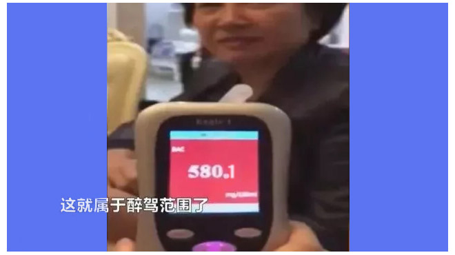邀请了一位不会喝酒的王女士,当场喝下小半杯白酒,30 秒后通过酒精测试仪检测,酒精浓度读数为 580.1 毫克每百毫升。