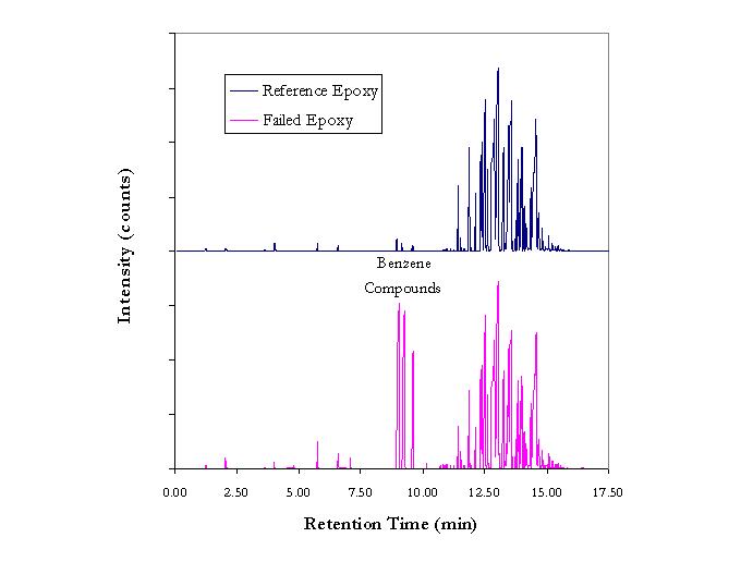 我们的一个制造客户发现他们设备中使用的环氧树脂无法按预期运行。执行环氧树脂脱气分析后,您可以看到我们测试并比较了两种不同的样品:参考环氧树脂(顶部)和失败的环氧树脂(底部)。结果表明,失效的环氧树脂在保留时间线(x 轴)上大约 9 分钟的标记处含有大量苯化合物(y 轴)——这在参考环氧树脂中是没有的。