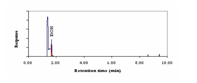 在此分析中,一位制药客户想知道在制造过程中使用的乙醇是否仍然存在于最终产品中。使用GC/MS 顶空分析,我们进行了残留溶剂测试以找出答案。如您所见,在大约 1.67 分钟处发现了一个可能的残留溶剂峰。然后我们将我们的发现与乙醇质谱数据进行比较,以确认残留峰实际上是乙醇。