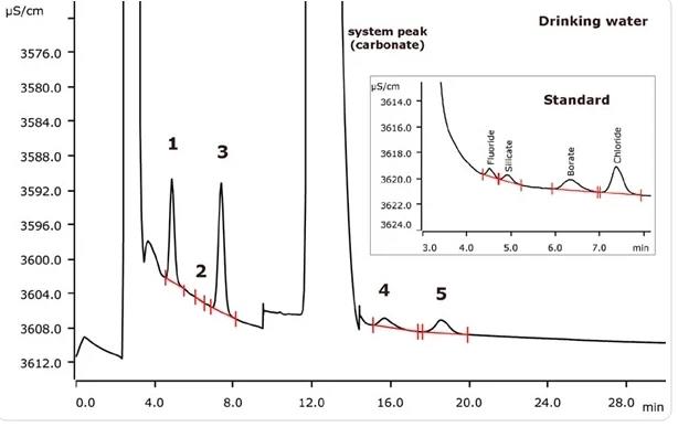 所示标准溶液中的浓度:氟化物 0.1 mg/L、硅酸盐 0.3 mg/L、硼酸盐和氯化物 1.0 mg/L