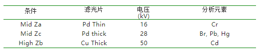 RoHS指令中五种有害元素的至佳测试条件如下所示,所有样品均在大气状态下测试,使用直径8.8mm的准直器可以获得至大的强度信号,保证了数据的稳定性。整个测试仅需要2~3分钟即可。