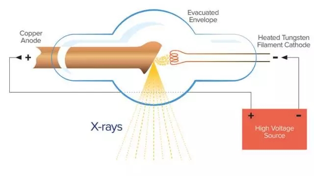 X 射线管是工作在高电压下的真空二极管,其包含有两个电极:一个是用于发射电子的灯丝,作为阴极;另一个是用于接受电子轰击的靶材,作为阳极。两级均被密封在高真空的玻璃或陶瓷外壳内。施加到该灯丝上的电流使其加热至1000摄氏度,因此它能发射出电子。一旦灯丝发射出电子,在灯丝和阳极之间施加高电压以加速电子在灯丝与阳极之间的移动。加速电子与阳极之间的相互作用即可以引起X射线的产生。阳极材料中的元素类型决定了发射出来X射线的能量大小。