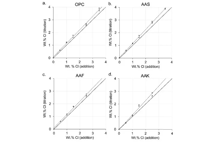 图1、比较了四种不同成分混凝土滴定法测得的WT%Cl值与加入混合水的WT%Cl的比值。
