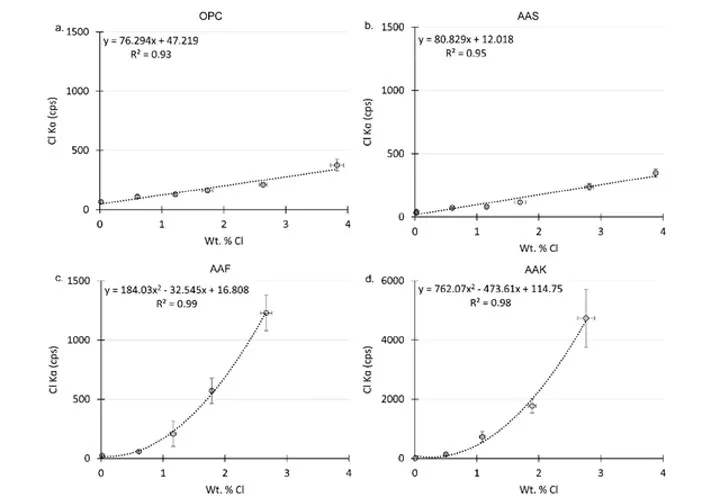 下方用微区X射线荧光光谱仪M4 TORNADO分析的X射线强度与混凝土样品中氯的质量百分比相关联,从用不同成分混凝土混合物的浆料成分制成的参考样品中建立校准曲线。