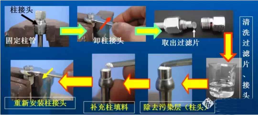重新安装时,可稍稍削去柱管输入端管口一薄层固定相(最好削后用同类固定相填补)然后装上过滤片,拧紧柱接头,封闭两端螺口。