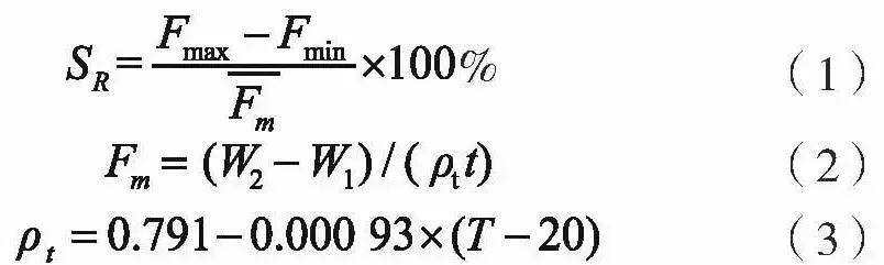 将仪器各部分连接好, 流动相用100%甲醇, 通过工作站或仪器操作面板设置检定流量 (如表1所示, 选择高、中、低三档流量逐一测定) , 启动仪器, 待压力稳定后, 在流动相出口处用容量瓶 (空瓶质量为W1) 收集流出液, 并同时用秒表计时t。在经检定合格的分析天平上称重, 质量为W2, 按式 (2) 、 (3) 计算实际所测流量值Fm, 重复三次, 得三次实测流量平均值, 按式 (1) 计算SR。SR为三档流量中最大值。