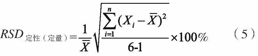 检定条件同2.2, 注入一定体积标准物质 (表4) 得色谱图, 积分得色谱峰保留时间 (用于定性) 和峰面积 (用于定量) , 重复6次, 根据式 (5) 分别计算定性、定量重复性。