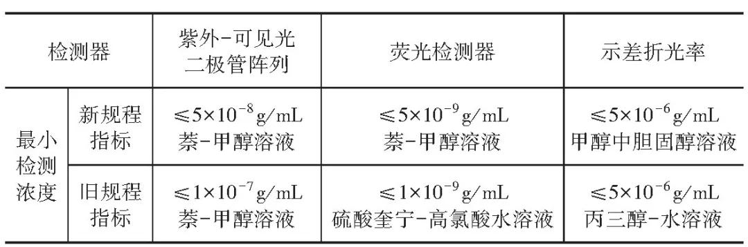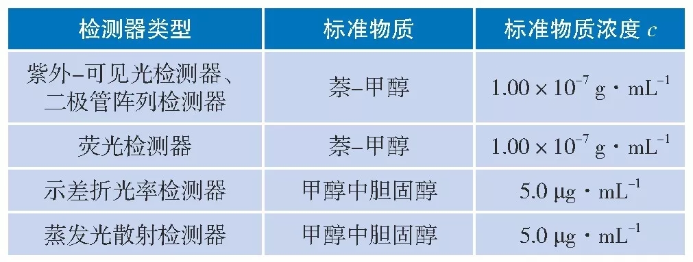 主要修订内容:增加了蒸发光散射检测器的检定内容, 同时将旧规程中荧光检测器检定用标准物质由硫酸奎宁-高氯酸水溶液改为萘-甲醇溶液, 将示差折光率检测器检定用标准物质由原来的丙三醇-水溶液改为甲醇中胆固醇溶液标准物质等。下面对修订的相应内容进行具体介绍及解释:
