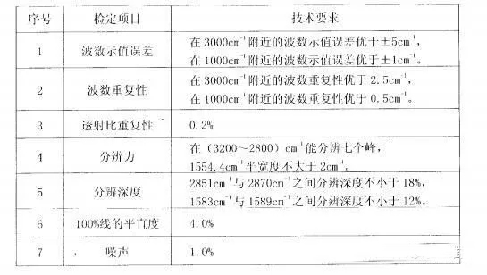 在计量性能要求方面,应该主要检定波数示值误差、波数重复性、透射比重复性、分辨力、分辨深度、100%线的平直度、噪声等,具体技术要求如下。