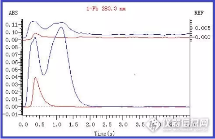 (1)关于这种现象我以前在版内有过专著文章。产生这种现象的原因也是灰化不彻底;但是这种不彻底与前面那种背景出峰早的现象有着本质上的不同。在这里,样品中的共存物的原子化的温度与待测元素的原子化温度相差无几,甚至比待测元素还要高。