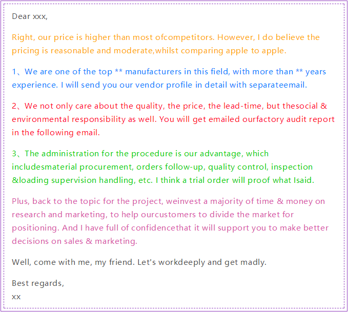 简单的一句远远不能够打动客户,我们应该有更专业的分析能力,让客户知道我们的价格为什么确实高,但是高的合情有合理。
